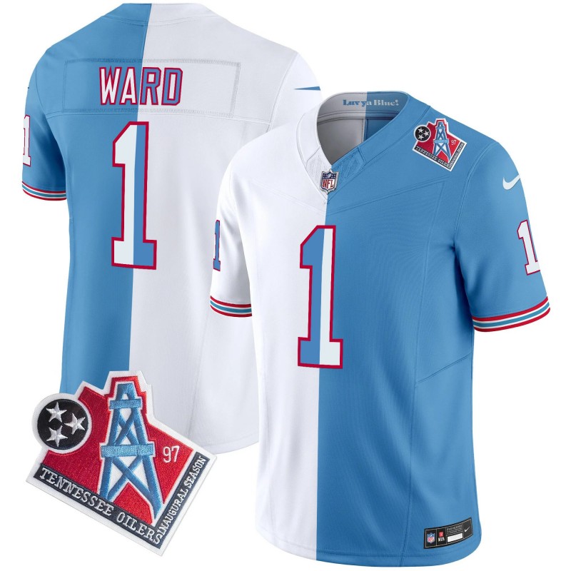 - Men's Tennessee Titans #1 Cameron Ward 2025 Draft 1997 Throwback Patch Vapor Limited Stitched Football Jersey Light Blue