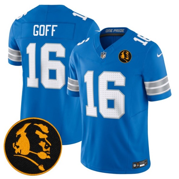 - Men's Detroit Lions #16 Jared Goff Blue 2023 Vapor With John Madden and 90th Anniversary Patch Limited Stitched NFL Jersey